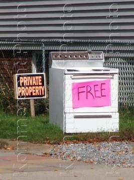 Жанровая фотография. Табличка "Частная собственность" и газовая плита с табличкой "Свободна".
