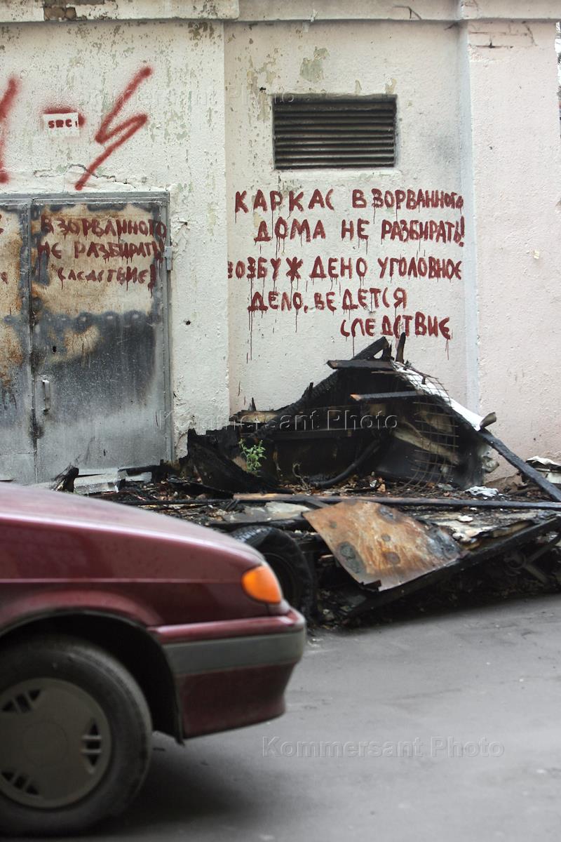 Жанровая фотография. Надпись на стене:"Каркас взорванного дома не разбирать! Возбуждено уголовное…