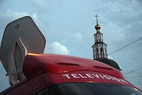 Жанровая фотография. Автобус с комплексом аппаратуры передвижной телевизионной станции и колокольня…