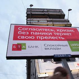 Рекламный щит банка БТА на улице города: "Согласитесь, кризис без паники теряет свою прелесть".