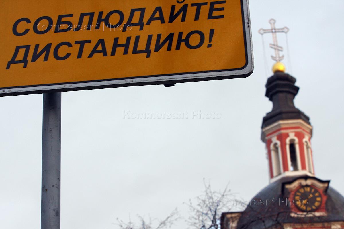Дорожный знак "Соблюдайте дистанцию!" на фоне Донского монастыря.