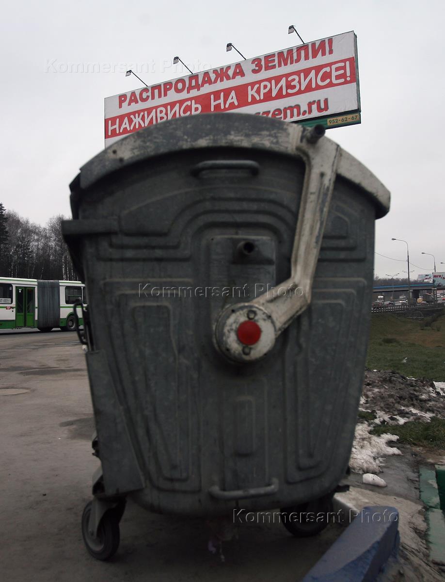 Жанровая фотография. Рекламный щит "Распродажа земли! Наживись на кризисе!" и мусорный контейнер в…