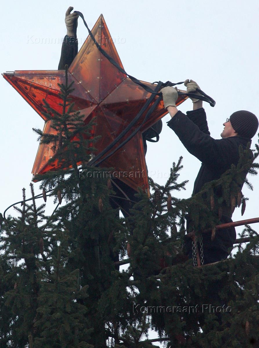 Жанровая фотография. Работники коммунальных служб устанавливают красную звезду на макушку новогодней…