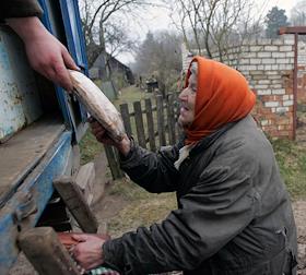 Жанровая фотография. Пожилые женщины покупают продуты в автолавке.