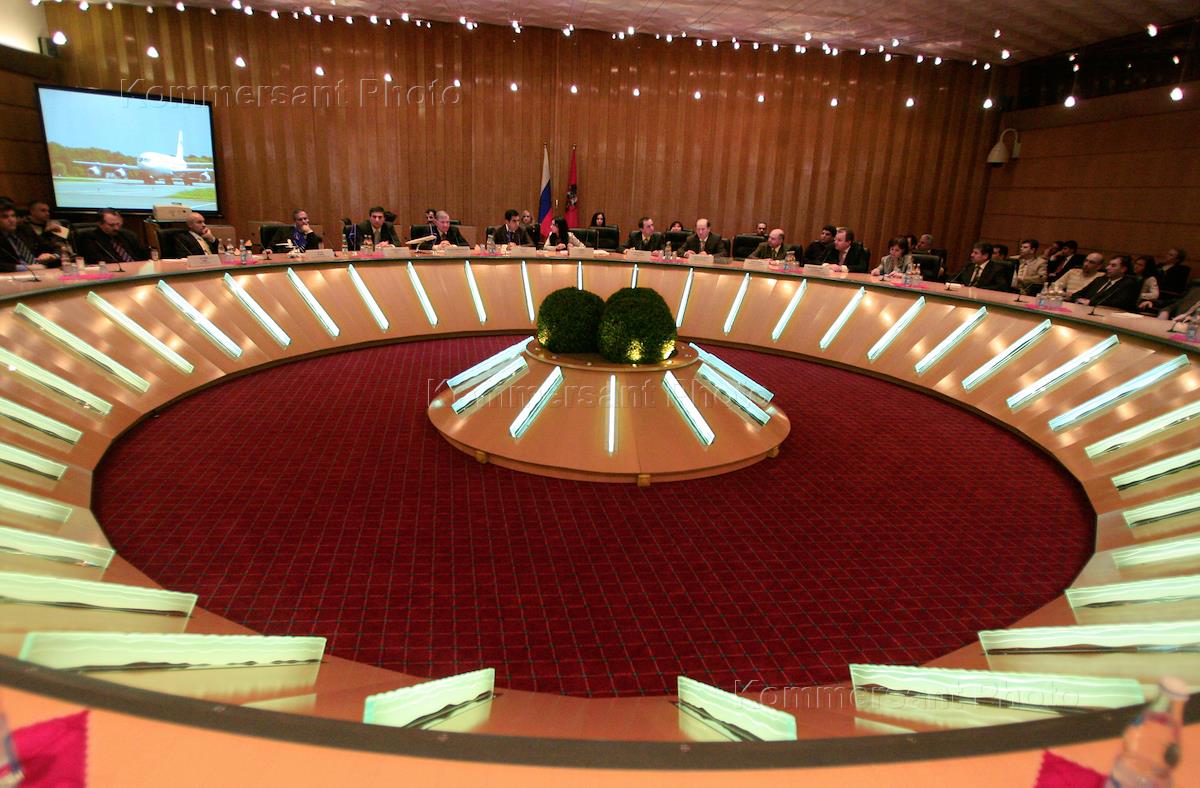 Пресс-конференция, посвящённая сотрудничеству аэропорта Внуково и авиакомпании "Сирийские авиалинии", в здании мэрии.