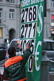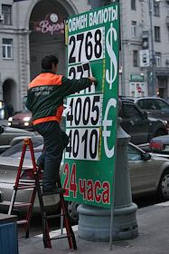 Муниципальный служащий изменяет курс валюты на информационном табло пункта обмена валюты.