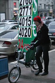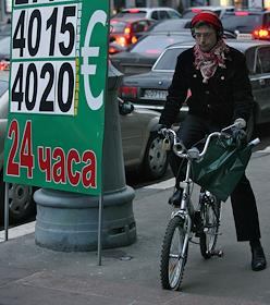 Жанровая фотография. Велосипедист ставит велосипед рядом с информационным табло пункта обмена валюты.