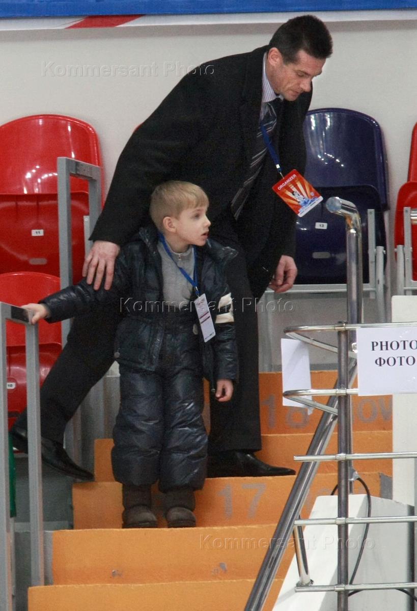 Младший сын президента Белоруссии Александра Лукашенко Коля (слева) на трибуне во время хоккейного…