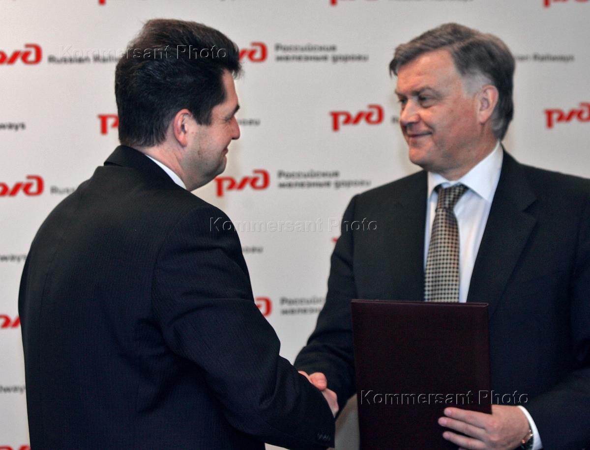 Президент ОАО "Российские железные дороги" (РЖД) Владимир Якунин (слева) и пресс-секретарь…