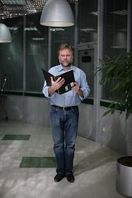 Евгений Касперский, генеральный директор "Лаборатории Касперского" во время интервью. Книга Н.Носова "Незнайка на луне"