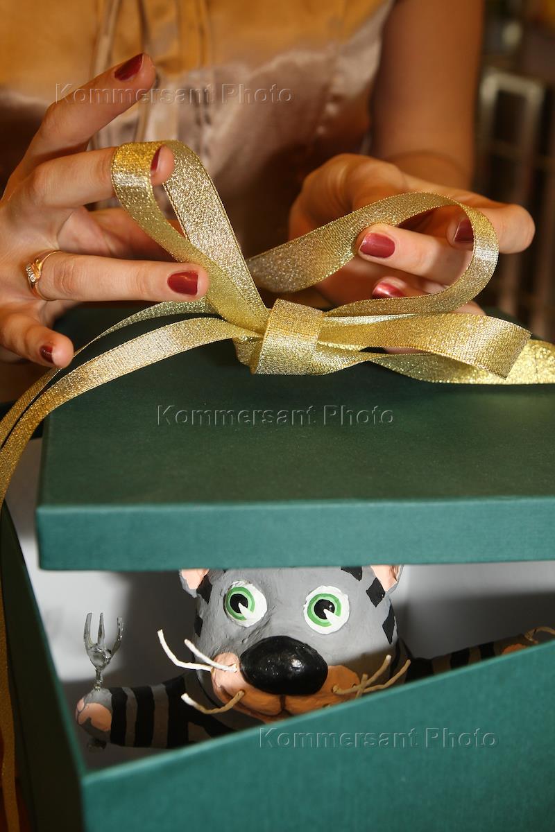 Жанровая фотография. Женщина открывает коробку с подарком.