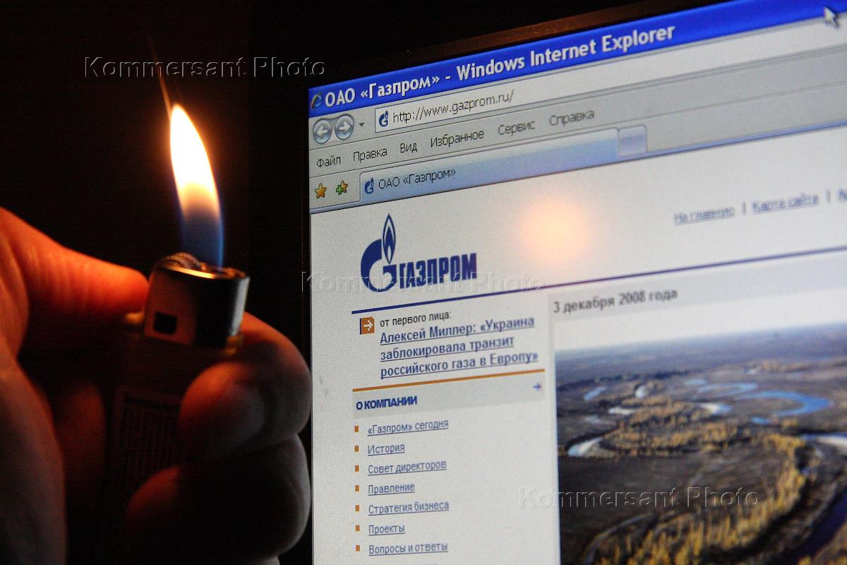 Жанровая фотография. Горящая зажигалка в руке на фоне монитора с открытым сайтом РАО "Газпром".