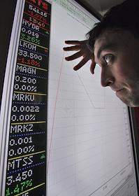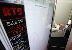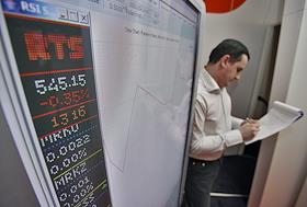 Электронное табло с курсами котировок акций Фондовой биржи "Российская Торговая Система" (РТС) на…