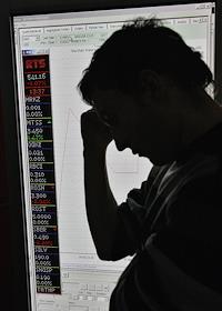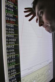 Жанровая фотография. Мужчина у стенда котировок акций в офисе Фондовой биржи "Российская Торговая…