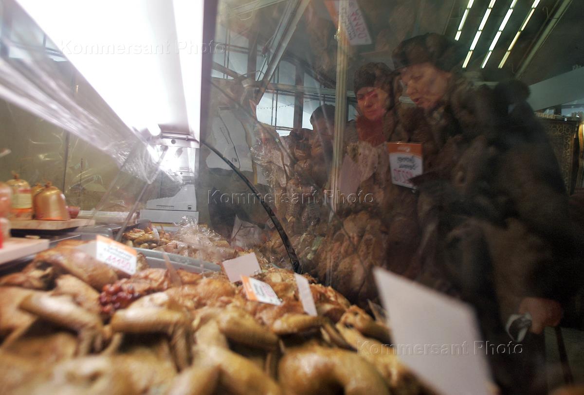 Жанровая фотография. Покупатели у прилавка с мясной продукцией.