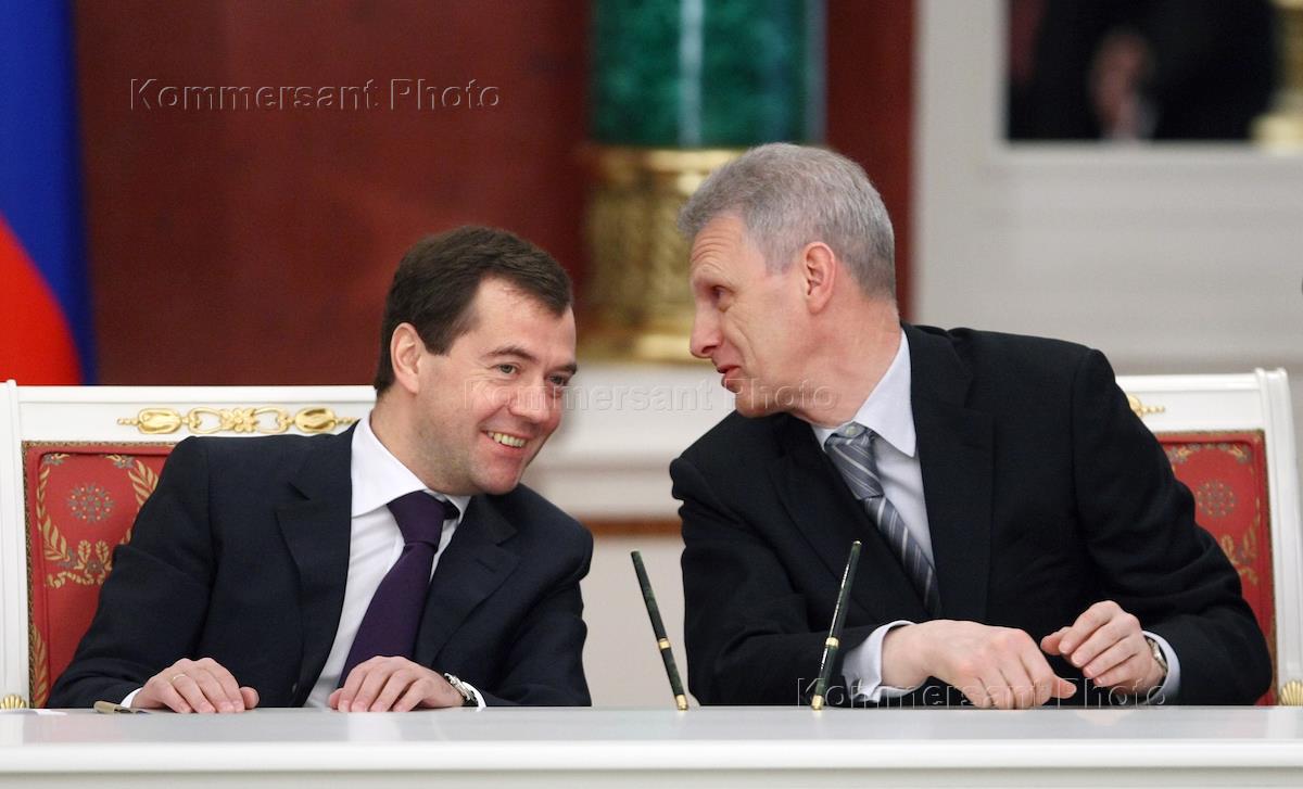 Президент России Дмитрий Медведев (слева) и первый заместитель министра финансов России Сергей…