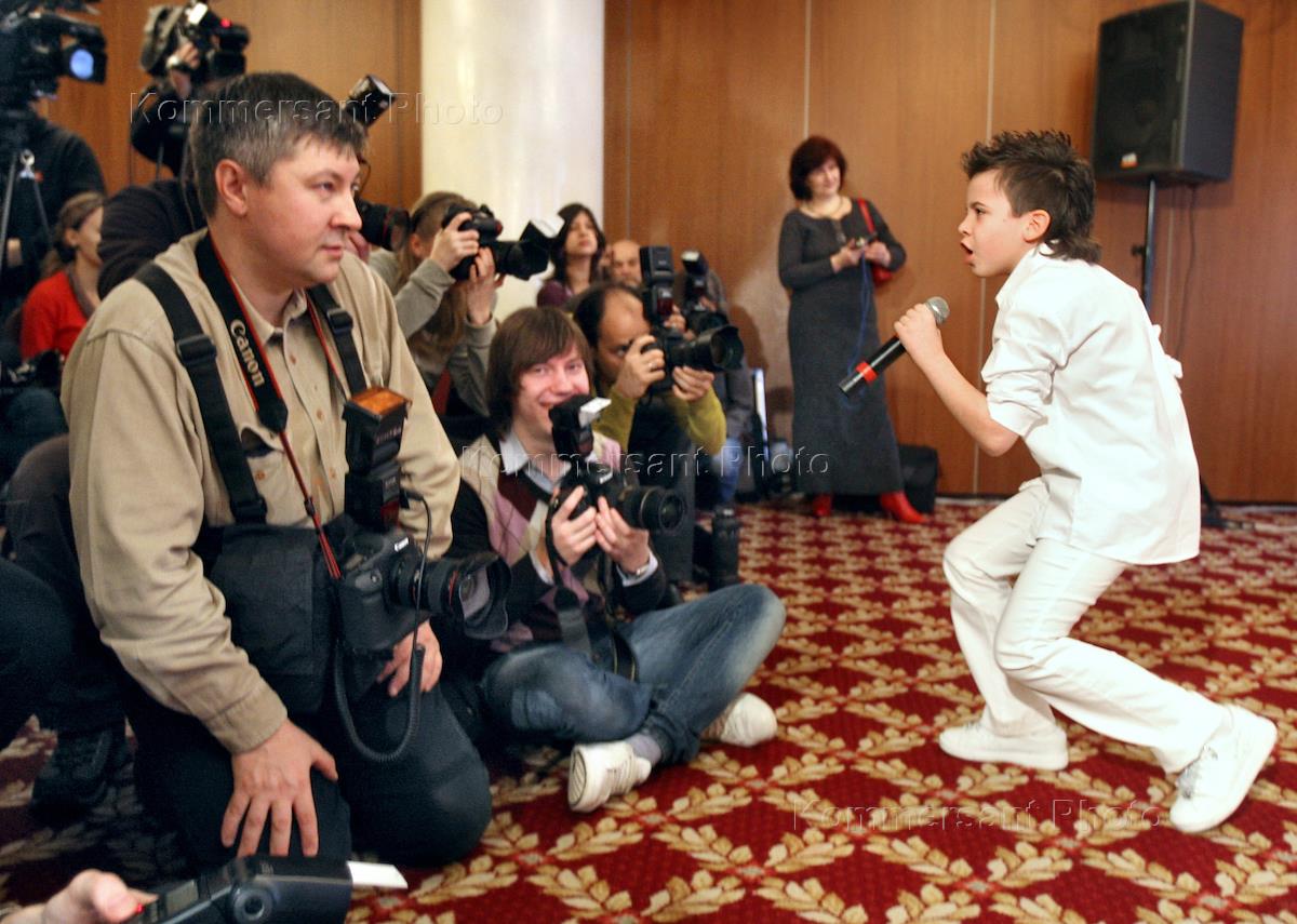 Участник детского "Евровидения-2008" Миша Пунтов (справа) во время выступления на жеребьевке…