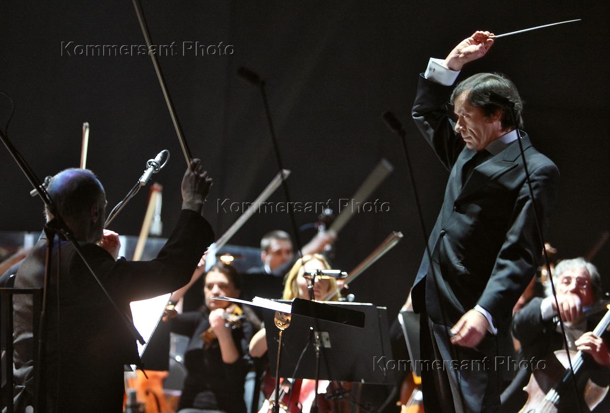Итальянский дирижер Марчелло Рота (справа) во время концерта оперного певца Андреа Бочелли в…