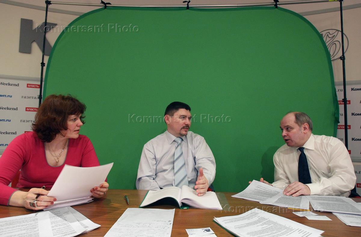 Экономика и бизнес Виталий Барсуков, учредитель компании "Ветфарм", Игорь Вайншток, генеральный директор научно-производственной компании ЗАО «Партнер», Ирена Бетанова, генеральный директор Центра делового развития "Бизнесград" во время заседания Круглого стола в переговорной ИД "Коммерсантъ".