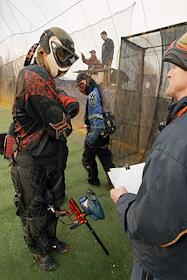 Человек за сеткой убирает территорию после игры в пейнтбол.