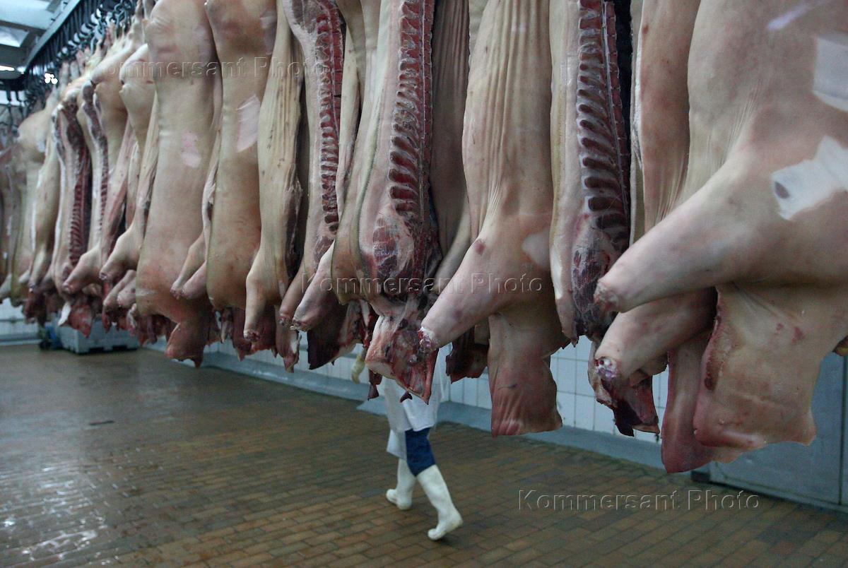 Туши свинины в цехе Останкинского мясоперерабатывающего комбината.