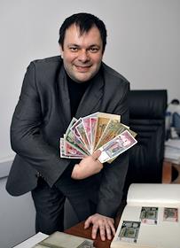 Генеральный директор страховой компании "Отечество" Павел Иванушко с коллекцией денежных купюр во…