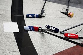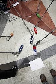 Жанровая фотография. Микрофоны ведущих телекомпаний лежат на полу в Информационном центре ЦИК.