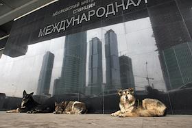 Вход на станцию метро "Международная" и стая спящих дворовых собак.