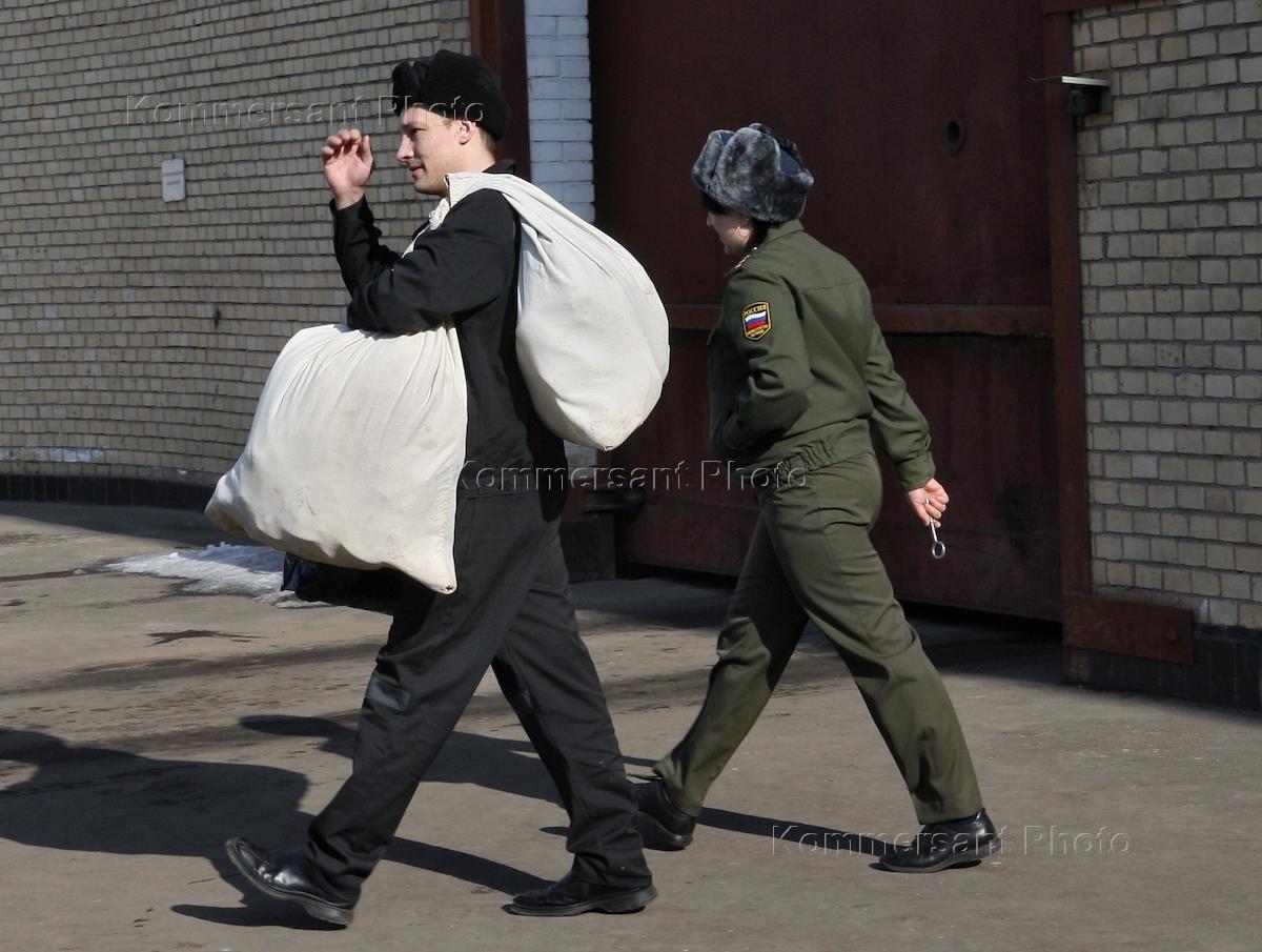 Женский следственный изолятор (СИЗО) "Печатники" (N77/6). Заключенный под конвоем несет мешки с…