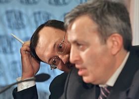 Руководитель департамента автострахования компании "Росгосстрах" Дмитрий Пурсанов (слева) и…