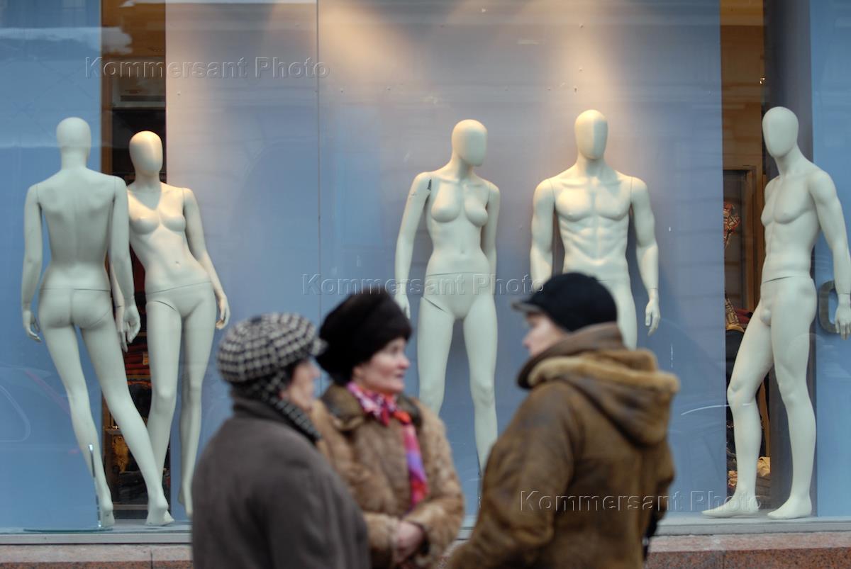 Жанровая фотография. Женщины на фоне витрины магазина с манекенами.