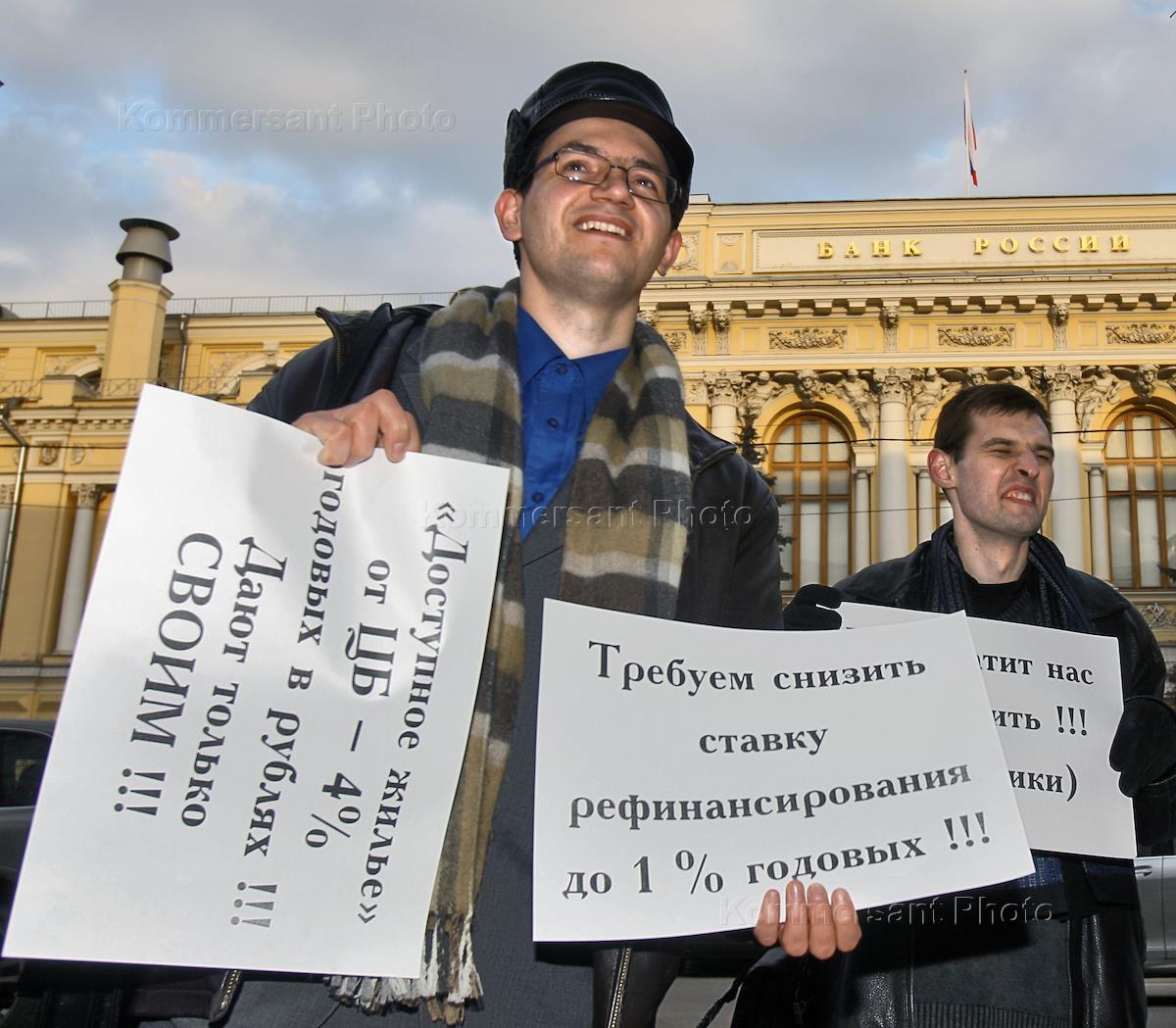 Экономика и бизнес Пикет под лозунгом "Центробанк компенсируй низкий курс рубля!", организованный сетевым объединением "ТИГР-Москва", сайтом "Грабежу.нет", заемщиками "Дельта-кредит", у здания Центрального банка РФ.