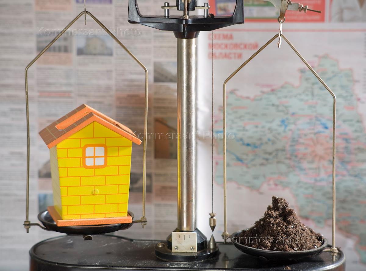 Макет дома на весах, на фоне карты, земли и часов. (Жанровая фотография).