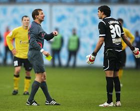 Чемпионат России по футболу. 2 Тур. Судья Николай Иванов (в центре) и вратарь команды "Динамо"…