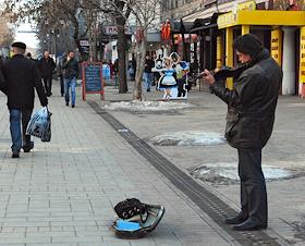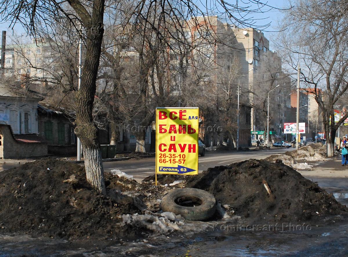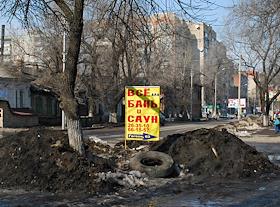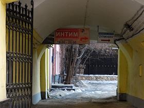 Виды города Саратова. Указатели магазина "Интим" и туристического агентства "Спутник-Волга" в арке…