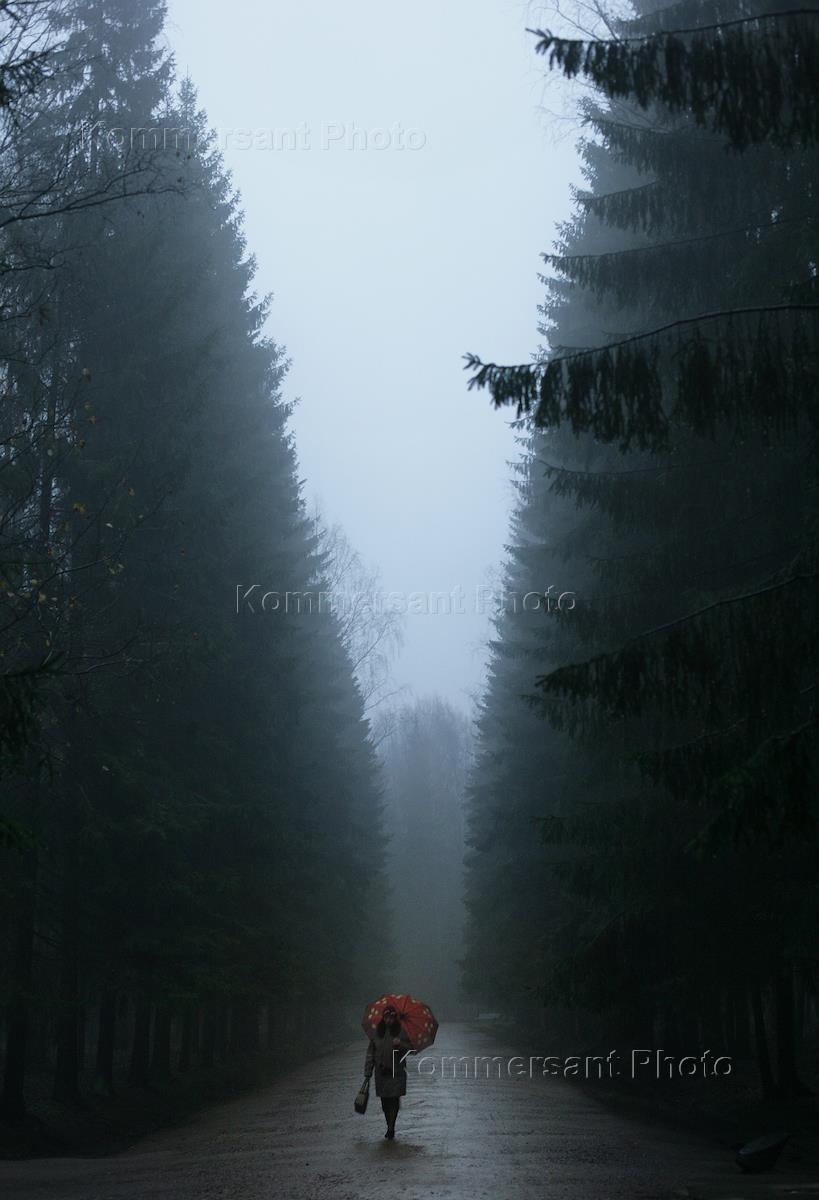 Жанровая фотография. Женщина под зонтом идет по аллеи парка.