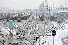 Жанровое фото. Погрузка контейнеров на железнодорожную платформу для транспортировки.