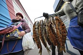 Жанровая фотография. Торговля копченой рыбой на железнодорожной станции.
