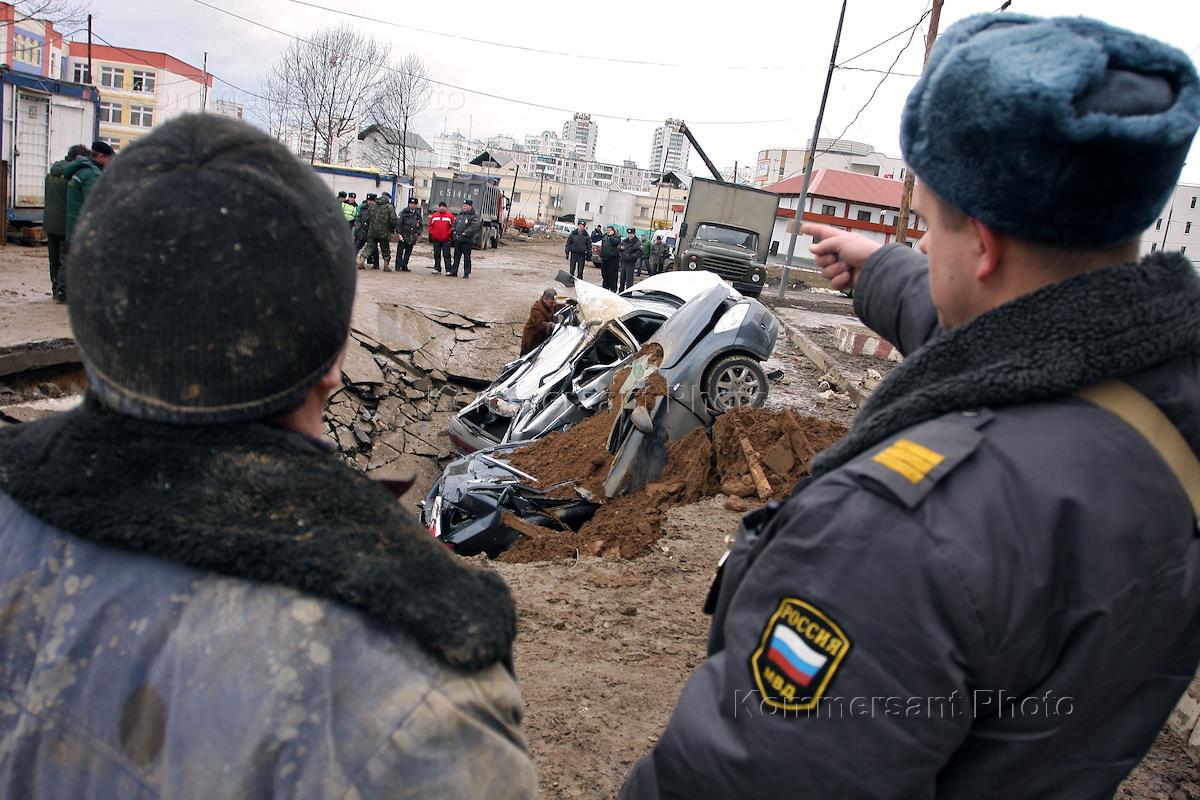 Сотрудники милиции на месте провала грунта на Изюмской улице в районе Южного Бутово.
