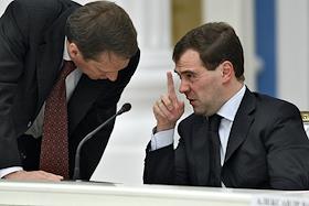 Руководитель администрации президента России Сергей Нарышкин (слева) и президент России Дмитрий…