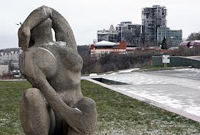 Жанровая фотография. Абстрактная каменная скульптура на фоне строящегося жилого дома.