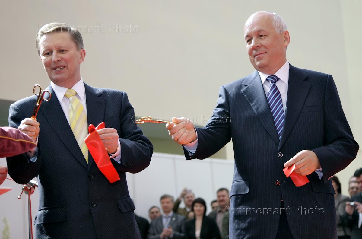 Заместитель председателя правительства России Сергей Иванов (слева) на церемонии открытия выставки…