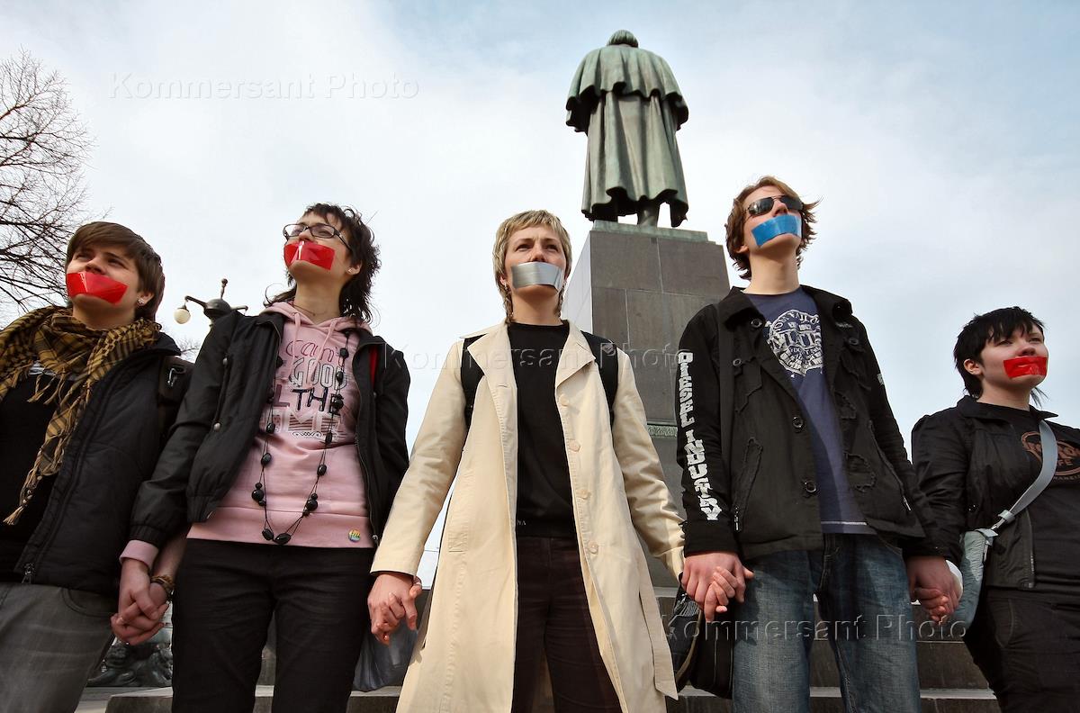 Общество Акция, посвященная проблеме замалчивания дискриминации по признаку сексуальной ориентации, организованная активистами LGBT-сообщества в международный День молчания, на Гоголевском бульваре.