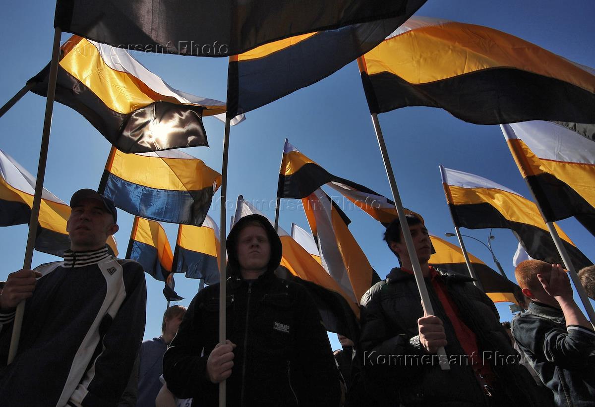 Участник митинга, организованного "Движением против нелегальной иммиграции" (ДПНИ) на площади у…