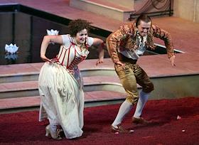 Актеры Марина Зудина (слева) и Родион Долгирев (справа)во время спектакля "Безумный день, или…