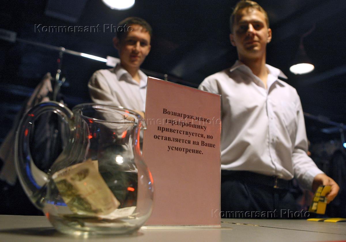 Гардероб в клубе "Б1 Maximum". Кувшин с денежными купюрами и табличка "Вознаграждение гардеробщику…