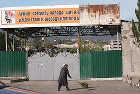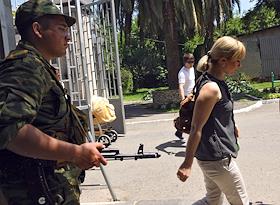Жанровая фотография. Женщина метет улицу перед проходной военной части абхазской армии.