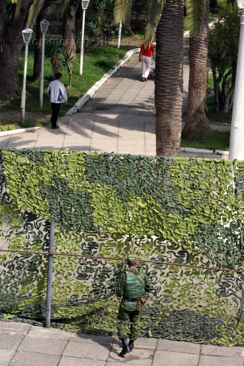 Жанровая фотография. Военнослужащий абхазской армии у проходной военной части.