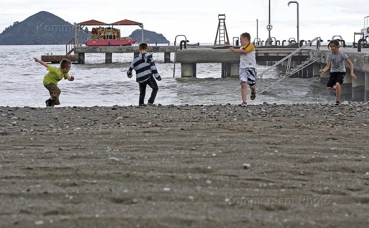 Жанровая фотография. Дети играют на пляже у пирса в Эгейском море.