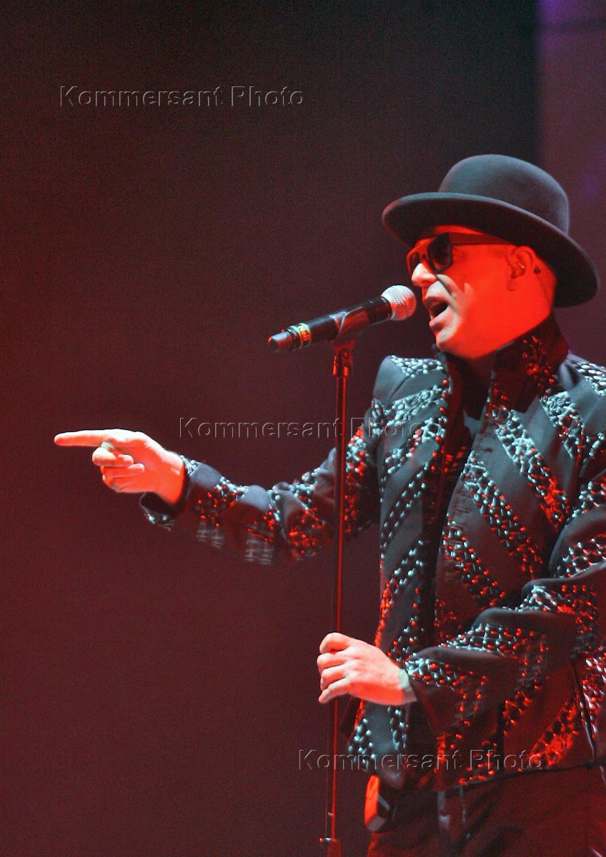 Британская группа Pet Shop Boys во время выступления на своем сольном концерте во Дворце спорта…